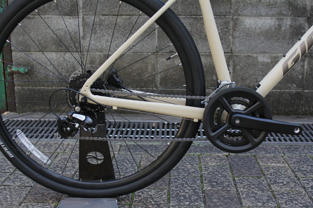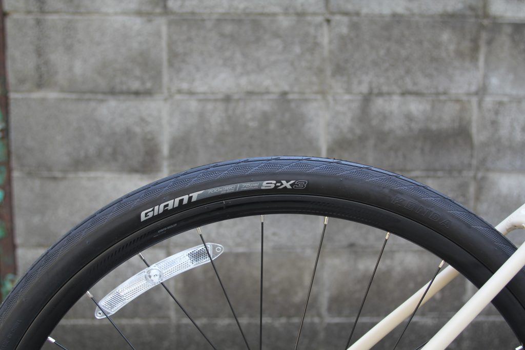『ESCAPE X』で最も特徴的なのが、700×38C(38mm)のワイドタイヤを採用しているところです。現在でも多くのクロスバイクが28mm~32mmが標準となっていますが、太いタイヤだと多少のデコボコ道も安心感があります。