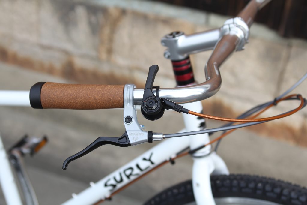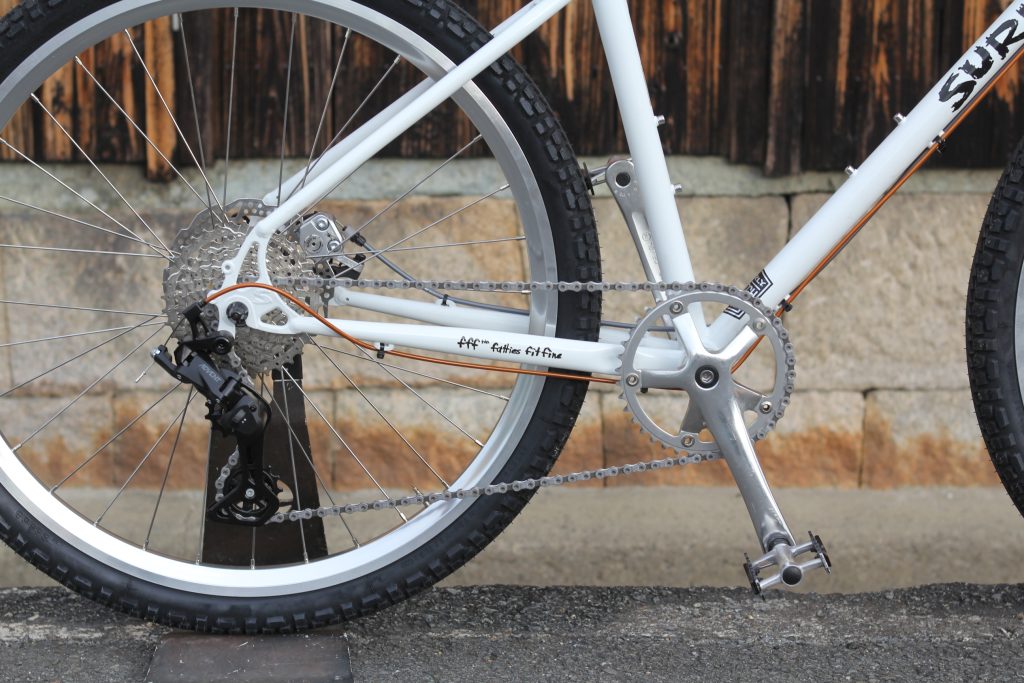 microshiftのサムシフターを使用した1×9速、タイヤは26インチにしたことにより2.0インチ幅のタイヤを装着することができました。もしよろしければどうぞ!