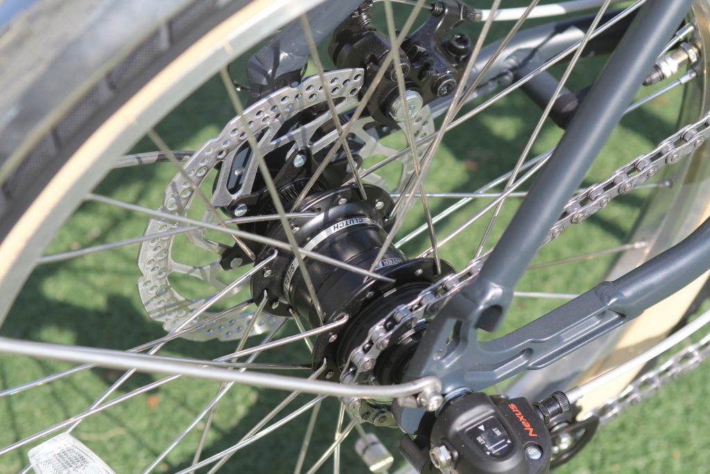 変速はSHIMANOの内装3段変速を採用。雨に強く、外装変速のようにメンテナンスの頻度が少なく済みます。