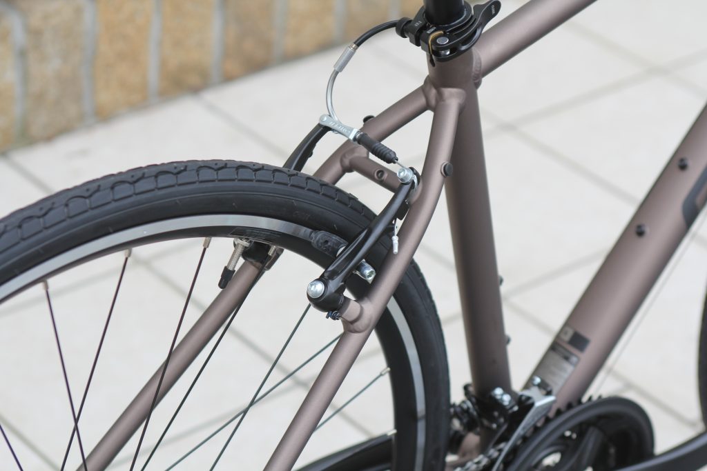 こちらがホイールのリムをブレーキパッドで止める「リムブレーキ」タイプです。