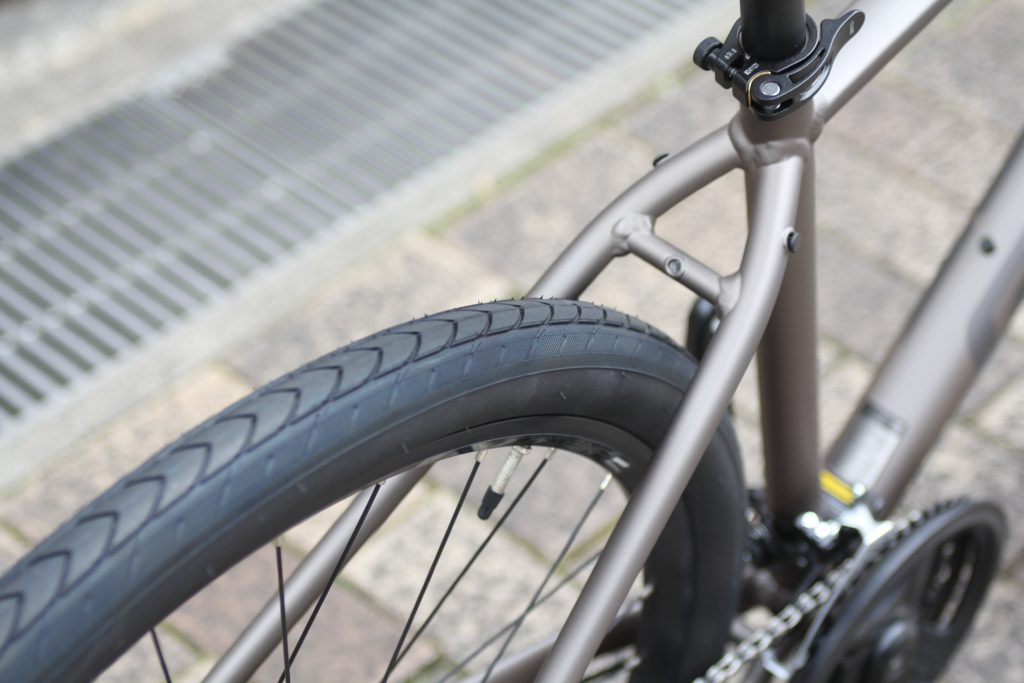タイヤ規格は700x28c。28mm前後のタイヤ幅であれば、舗装路の走行で軽快さを感じられ、はじめてスポーツバイクに乗られる方には感動ものかと思います。(自転車ってこんなに軽いものだったのか…と)